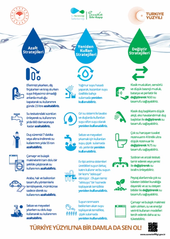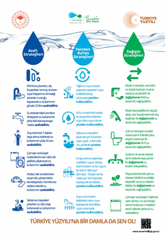 Ülkemizde su stresi baskısı olmadan, ihtiyaçlarımızdan feragat etmeden, yaşam standartlarımızı düşürmeden, müreffeh şekilde yaşamımıza devam edebilmek için “suda sıfır kayıp” bilinci ile bütün kurum/kuruluşlarımızı, çiftçilerimizi, sanayicilerimizi, çocuklarımızı kısacası her bir vatandaşımızı suyumuzu verimli kullanmaya davet ediyoruz. Çünkü “su vatandır”, “su medeniyettir”, “su geleceğimizdir”.